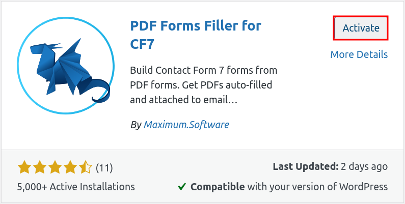Download and install the PDF Forms Filler for CF7 plugin. You can also install the plugin from the admin panel of your WordPress site. In the plugin search bar, enter “pdf forms filler”, install and activate the plugin. You will also need to install the Contact Form 7 plugin.