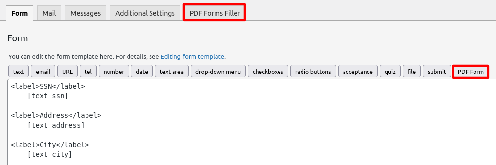 After you have activated the plugin, create a Contact Form 7 form and access the form editor tab. You should see the PDF Form button and the PDF Forms Filler tab.