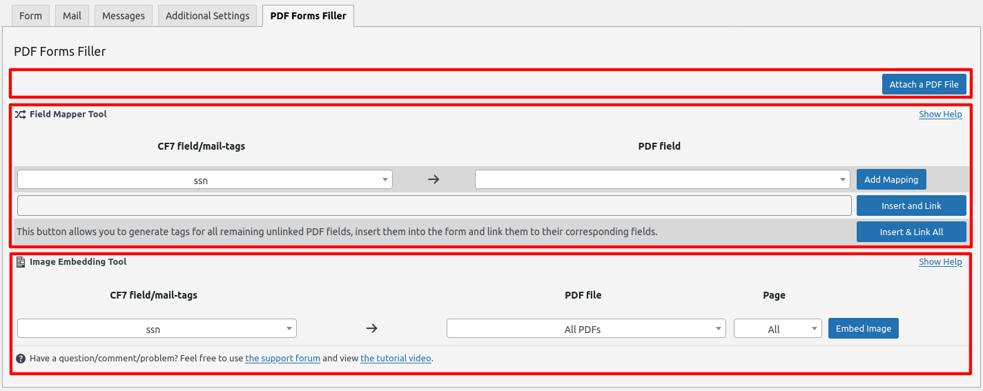 The PDF Forms Filler tab provides comprehensive access to all current plugin features and settings in a well-organized interface. Alternatively, the PDF Form button opens a form-tag generator thickbox that contains shortcuts to the main tab functionality along with some legacy options. By navigating to the PDF Forms Filler tab, you will see three main sections: