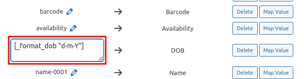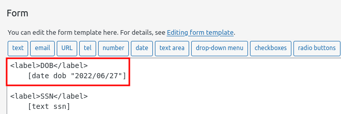 [_format_{field name} "date format"]. Replace{field name}with the name of your field, which isdob. Replacedate formatwith the desired date format, based on the CF7 format column in the date format conversion table. In our example, it isd-m-Y. See more details in the CF7 documentation.