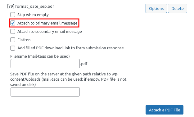 After you attach the PDF file, click on the Options button, check the Attach to primary email message box and save the changes.