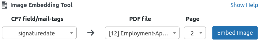 Access the PDF Form form-tag generator thickbox, scroll down to the Image Embedding Tool, select the file field from the CF7 field/mail-tags dropdown, select the PDF file and page that you want to embed the image into and click the Embed Image button.