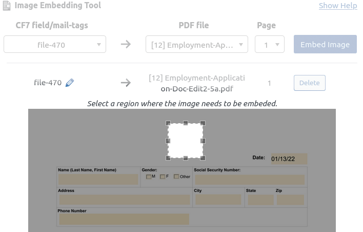 CF7 field/mail-tagsdropdown in theImage Embedding Toolto select the newly createdimage-embeddingfield. We need to select the PDF file in thePDF filedropdown and1in thePagedropdown.Image Embedding Tool Interface