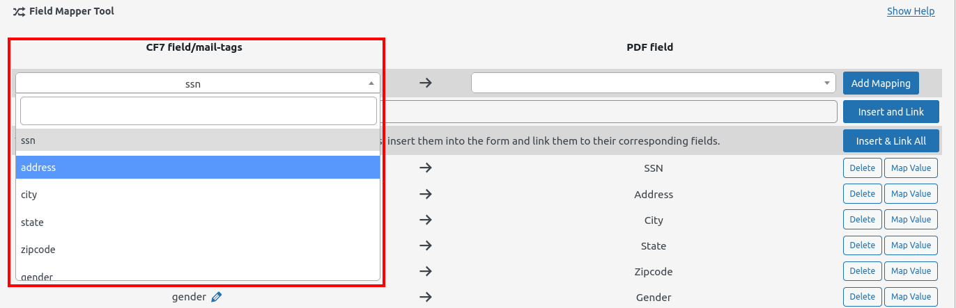 - The field mapping creation elements that allow users to create a new CF7 form-tag and map it with a single click or generate form-tags for all remaining unmapped PDF fields, insert them into the CF7 form and link them to their corresponding fields.