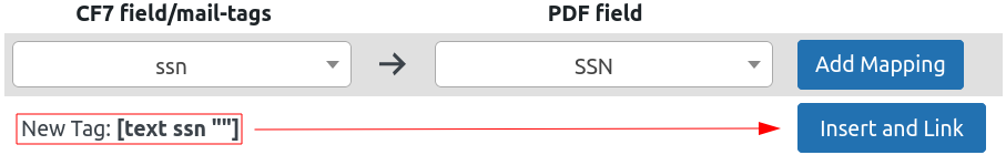 When a field is selected in the PDF field dropdown, the New Tag hint for the selected PDF field is shown under the dropdown. The new form-tag can be inserted into the CF7 form and a mapping can be automatically created by clicking the Insert and Link button. Tags are inserted at the current cursor position.