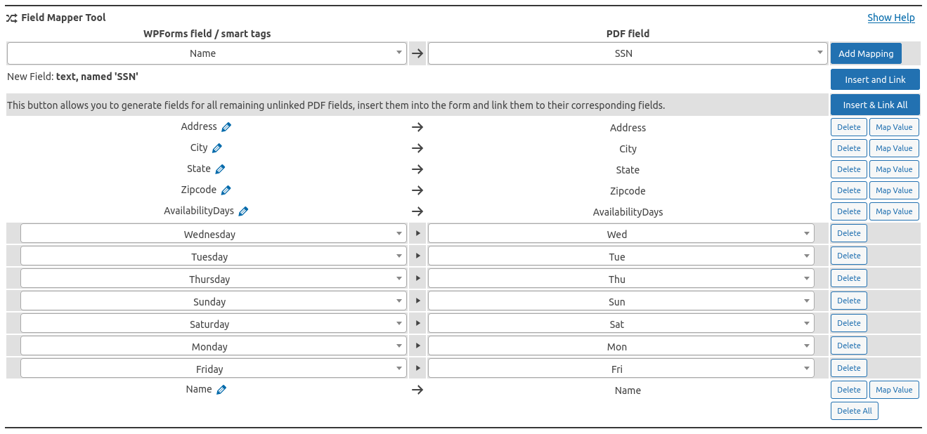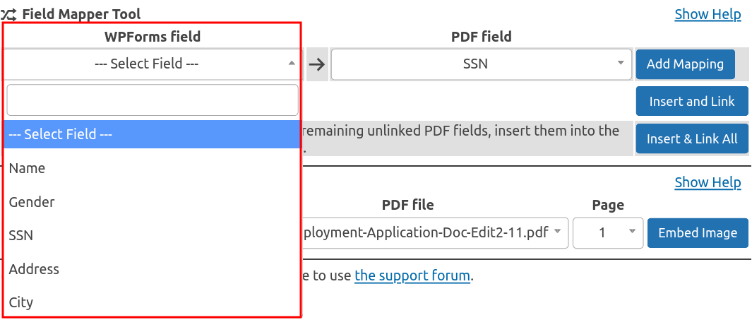 - Creates mappings between the WPForms fields and their corresponding PDF fields
